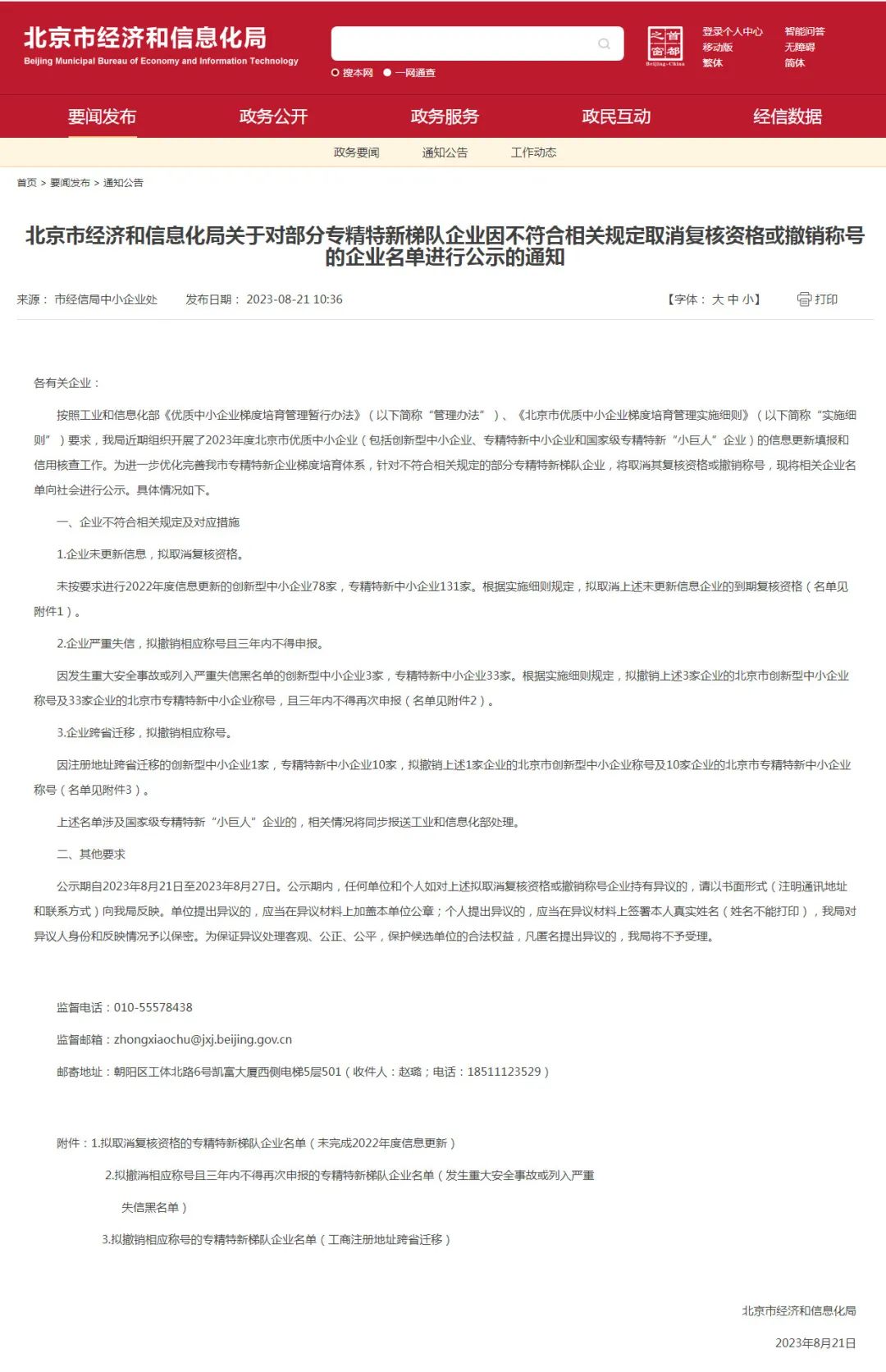 8月21日,北京市經信局官網公布消息顯示,為進一步優化完善北京市專精特新企業梯度培育體系,針對不符合相關規定的部分專精特新梯隊企業,將取消其復核資格或撤銷稱號,并將相關企業名單向社會進行公示。公示名單共涉及北京174家專精特新中小企業和82家創新型中小企業!