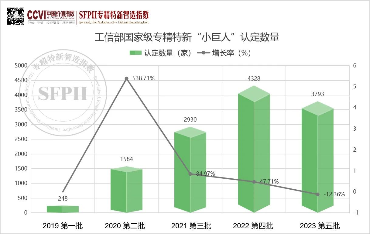 據(jù)SFPII專(zhuān)精特新智造指數(shù)跟蹤顯示,2023年工信部第五批國(guó)家級(jí)專(zhuān)精特新“小巨人”企業(yè)認(rèn)定共計(jì)3793家,該批申請(qǐng)數(shù)量創(chuàng)歷史新高,合計(jì)約17000家,但是通過(guò)率創(chuàng)歷史新低,約22.3%。截至2023年底,全國(guó)共有12756家“專(zhuān)精特新”小巨人企業(yè),提前并超額完成了“到2025年,培育1萬(wàn)家國(guó)家級(jí)專(zhuān)精特新‘小巨人’企業(yè)”的目標(biāo)”。