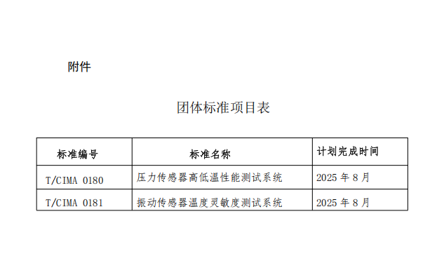 根據《中國儀器儀表行業協會團體標準管理辦法》的規定,經審查,對由中國航空工業集團公司北京長城計量測試技術研究所(簡稱“304所”)提出的《壓力傳感器高低溫性能測試系統》 《振動傳感器高低溫性能測試系統》2項團體標準進行立項(標準編號和標準名稱見公告附件),特此公告。