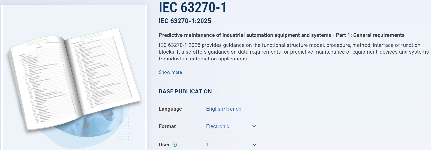 2025年4月17日,我國(guó)牽頭制定的國(guó)際標(biāo)準(zhǔn)IEC 63270-1:2025 《Predictive maintenance of industrial automation equipment and systems -Part 1: General requirements》正式發(fā)布。這是IEC首項(xiàng)預(yù)測(cè)性維護(hù)國(guó)際標(biāo)準(zhǔn),標(biāo)志著我國(guó)在預(yù)測(cè)性維護(hù)技術(shù)研究與國(guó)際標(biāo)準(zhǔn)化領(lǐng)域取得突破性進(jìn)展,為人工智能與制造業(yè)深度融合注入新動(dòng)能。