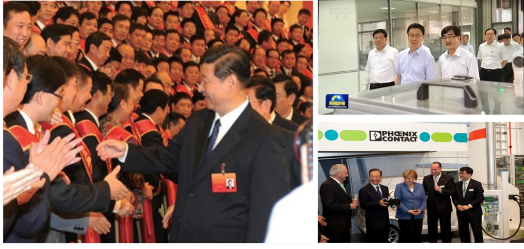 (左圖:公司被授予“全國模范勞動關系和諧企業“稱號,習近平等黨和國家領導接見中國公司總裁顧建黨先生;右上:韓正副總理蒞臨菲尼克斯電氣中國公司視察;右下:時任總理溫家寶和德國總理Angela Dorothea Merkel蒞臨菲尼克斯電氣展臺視察)