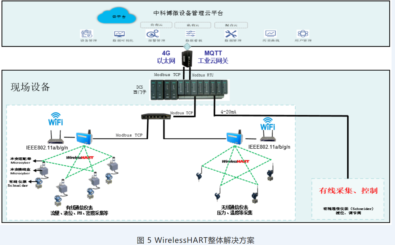 中科博微目前已經(jīng)將WirelessHART國產(chǎn)化產(chǎn)品研發(fā)逐步轉(zhuǎn)移打造適應(yīng)不同工況的WirelessHART產(chǎn)品整體解決方案階段,基于WirelessHART國產(chǎn)化產(chǎn)品,打通“上游”“下游”國產(chǎn)化保障渠道,開發(fā)設(shè)備管理軟件平臺,如:NCS-View、NCS-AMS等,實現(xiàn)多協(xié)議無線網(wǎng)絡(luò)深度融合及數(shù)據(jù)互聯(lián),基于交叉融合特征的集成化創(chuàng)新、滲透輻射特征的跨領(lǐng)域創(chuàng)新,應(yīng)對疫情環(huán)境下帶來的行業(yè)商業(yè)模式創(chuàng)新,實現(xiàn)以工業(yè)物聯(lián)網(wǎng)架構(gòu)下的行業(yè)整體解決方案,逐步完成布局,建立并形成工業(yè)物聯(lián)網(wǎng)完善的生態(tài)圈建設(shè)。如圖5所示。