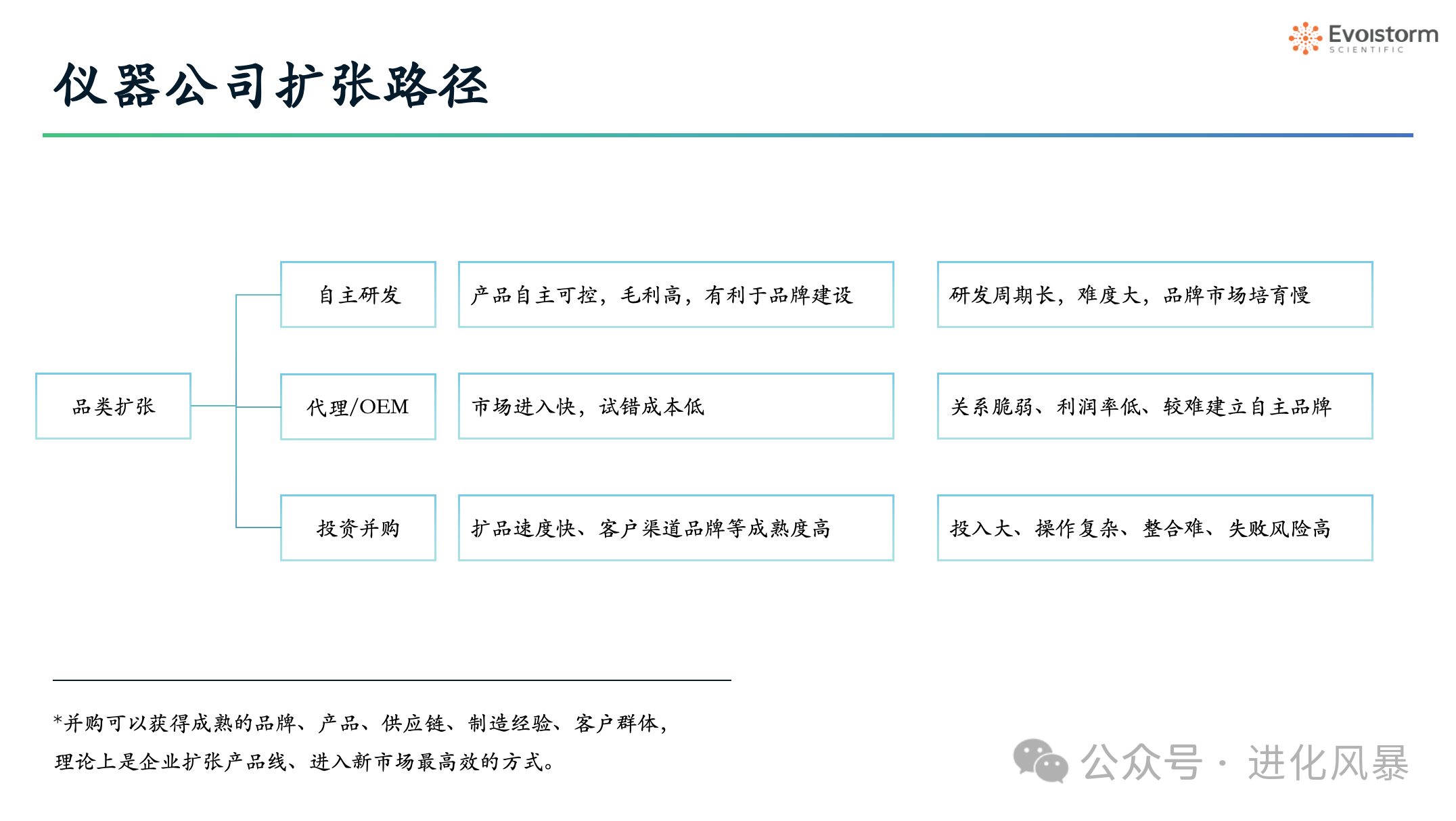進化風(fēng)暴認為,一家優(yōu)秀的科學(xué)儀器公司本質(zhì)是學(xué)會合理利用本文提到的幾種不同模式的擴張方法,能根據(jù)不同的市場、不同的產(chǎn)品階段、不同的競爭格局選擇最優(yōu)的進入和退出路徑。既不是死鉆牛角尖搞大躍進式的全面競爭,也不是攤大餅式地盲目并購,更不是只吞不吐地做一只貔貅。