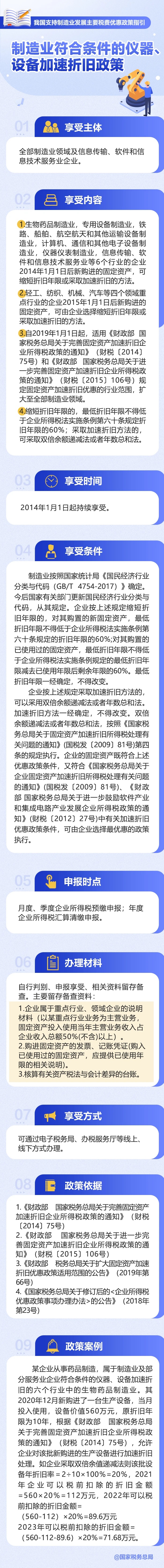 制造業(yè)是立國之本、強國之基,是實體經(jīng)濟的重要組成部分。中央經(jīng)濟工作會議指出,“落實好結構性減稅降費政策,重點支持科技創(chuàng)新和制造業(yè)發(fā)展”。為使大家更加全面熟悉了解政策、更加高效準確適用政策,財政部、國家稅務總局近日發(fā)布《我國支持制造業(yè)發(fā)展主要稅費優(yōu)惠政策指引》。今天帶你了解:制造業(yè)符合條件的儀器、設備加速折舊政策。