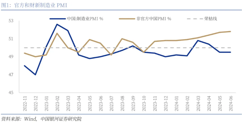 財(cái)新PMI再度上行,與中采PMI背離繼續(xù)走闊。7月1日,財(cái)新發(fā)布6月PMI錄得51.8%,環(huán)比上漲0.1pct,在擴(kuò)張區(qū)間再次上行。財(cái)新PMI在2023年11月以來持續(xù)強(qiáng)勢,連續(xù)8個(gè)月保持?jǐn)U張。但與此同時(shí)官方制造業(yè)PMI和財(cái)新PMI卻持續(xù)背離,這8個(gè)月期間官方制造業(yè)PMI平均為49.61%,而財(cái)新PMI均值為51.15%,且背離幅度有走闊趨勢。