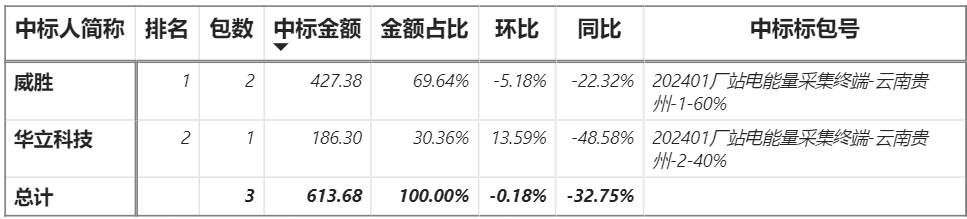 總金額613.68萬元,2家企業實現中標,威勝中標2包共427.38萬元;