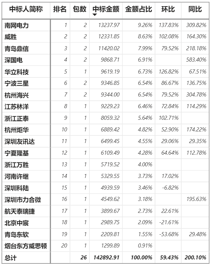 總金額14.29億元,20家企業實現中標;南網科技、威勝、鼎信、深國電、三星、海興中標2包;