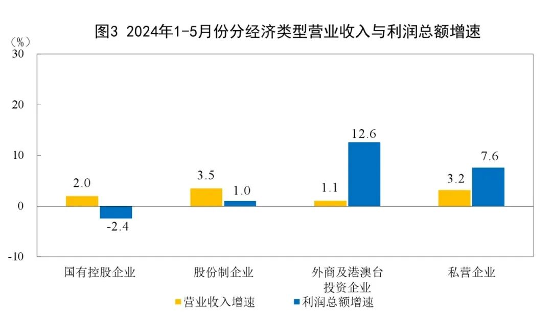 1—5月份,規(guī)模以上工業(yè)企業(yè)中,國有控股企業(yè)實現(xiàn)利潤總額9438.4億元,同比下降2.4%;股份制企業(yè)實現(xiàn)利潤總額20510.5億元,增長1.0%;外商及港澳臺投資企業(yè)實現(xiàn)利潤總額6827.8億元,增長12.6%;私營企業(yè)實現(xiàn)利潤總額7329.3億元,增長7.6%。