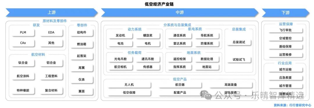 低空經濟產業鏈以低空空域和通用航空產業為基礎,涉及原材料供應、基礎設施建設、低空制造與飛行等多個環節。