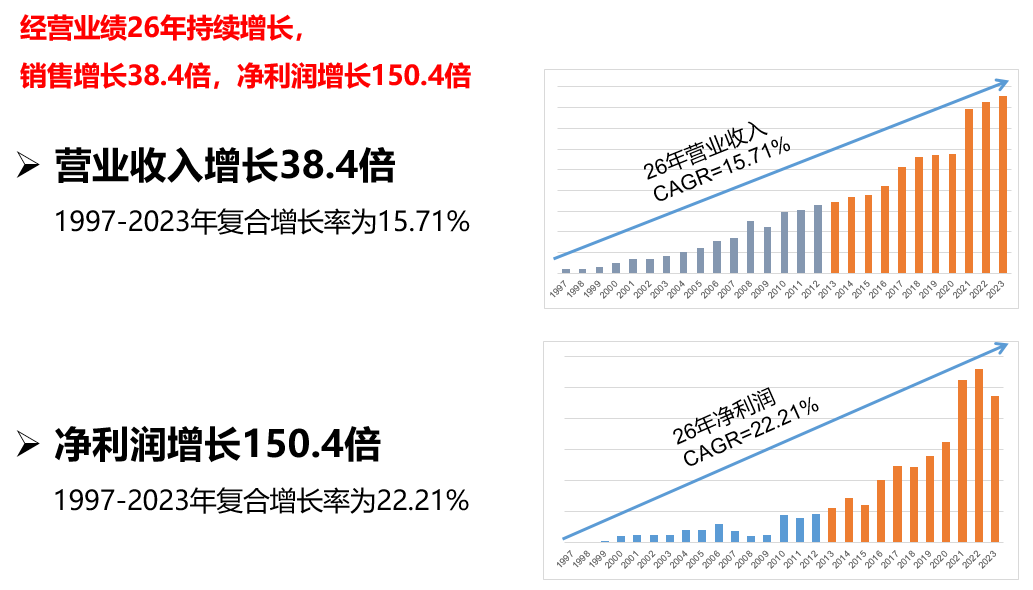 成立26年來(lái),公司銷售增長(zhǎng)38.4倍,凈利潤(rùn)增長(zhǎng)150.4倍,凈利潤(rùn)年復(fù)合增長(zhǎng)達(dá)22.21%。