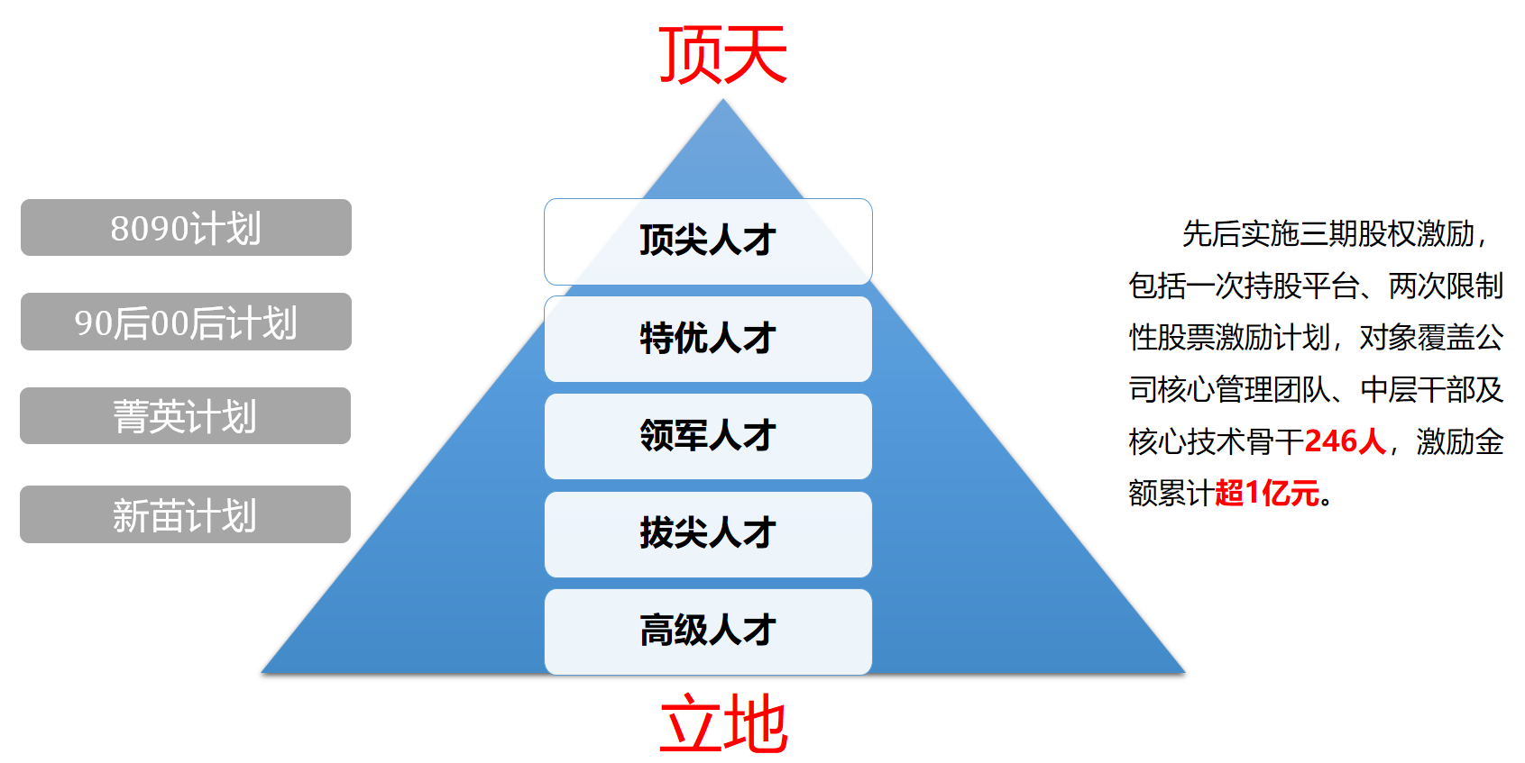實(shí)施面向中高層團(tuán)隊(duì)的8090計(jì)劃,面向年輕人才的菁英計(jì)劃、新苗計(jì)劃,面向骨干的股權(quán)激勵(lì)計(jì)劃,并建立起學(xué)習(xí)型員工賦能體系。