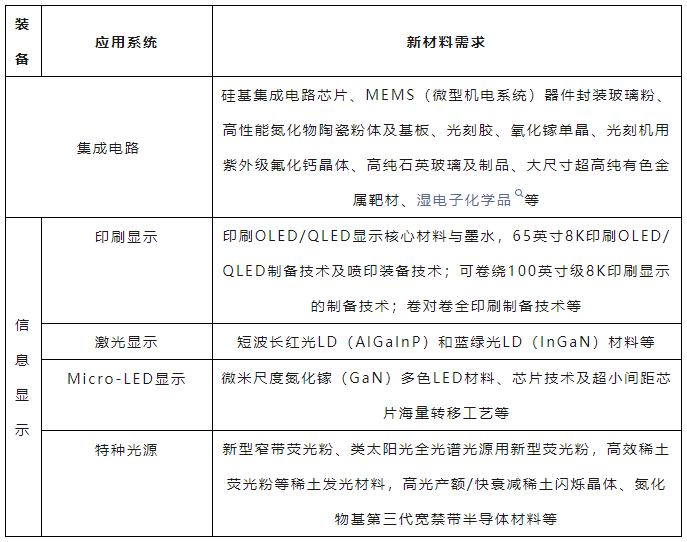 集成電路與信息顯示是我國(guó)電子信息產(chǎn)業(yè)的兩大基石,是信息領(lǐng)域?yàn)閿?shù)不多的千億美元級(jí)產(chǎn)業(yè),帶動(dòng)力和輻射力極強(qiáng),在我國(guó)國(guó)民經(jīng)濟(jì)中占有極其重要的戰(zhàn)略地位,信息顯示領(lǐng)域新材料需求見(jiàn)表3。新型信息技術(shù)及產(chǎn)業(yè)的發(fā)展需要電子信息材料支撐,當(dāng)前我國(guó)電子信息材料研發(fā)技術(shù)與發(fā)達(dá)國(guó)家存在較大差距。