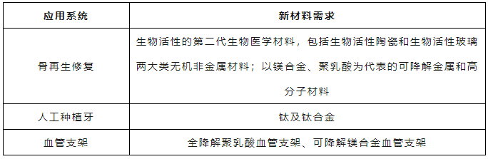 隨著全球人口老齡化日益加劇,人們對(duì)自身健康的關(guān)注度不斷提高,健康產(chǎn)業(yè)進(jìn)入加速發(fā)展時(shí)期。生物醫(yī)用材料的快速突破,將在疾病快速診斷、人體器官修復(fù)移植方面為人類帶來(lái)福祉,對(duì)國(guó)家的醫(yī)療安全、人民健康產(chǎn)生至關(guān)重要的影響,生命健康領(lǐng)域新材料需求見(jiàn)表4。