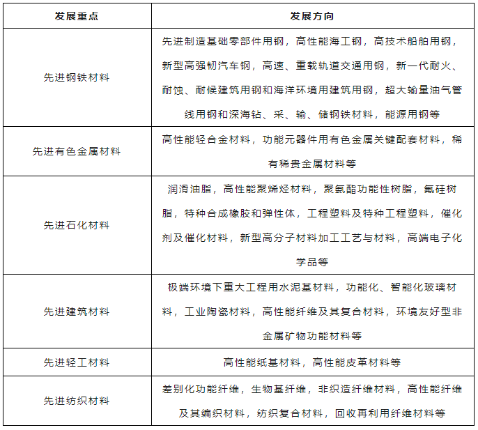 先進(jìn)基礎(chǔ)材料領(lǐng)域發(fā)展重點(diǎn)及發(fā)展方向主要包括先進(jìn)鋼鐵材料、先進(jìn)有色金屬材料、先進(jìn)石化材料、先進(jìn)建筑材料、先進(jìn)輕工材料及先進(jìn)紡織材料等(見(jiàn)表5)。