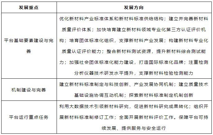新材料評(píng)價(jià)、表征、標(biāo)準(zhǔn)平臺(tái)建設(shè)主要包括平臺(tái)基礎(chǔ)要素建設(shè)與完善、機(jī)制建設(shè)與完善、平臺(tái)運(yùn)行重點(diǎn)任務(wù)等重點(diǎn)發(fā)展方向(見(jiàn)表8)。