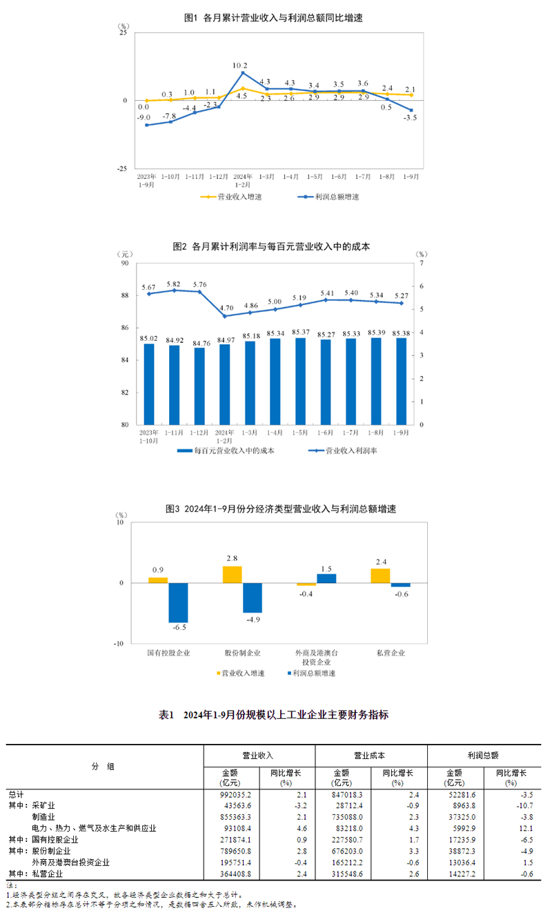 1—9月份,全國規(guī)模以上工業(yè)企業(yè)實(shí)現(xiàn)利潤總額52281.6億元,同比下降3.5%(按可比口徑計(jì)算,詳見附注二)。