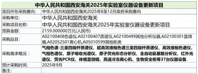 中華人民共和國西安海關(guān)2025年8至12月政府采購意向-中華人民共和國西安海關(guān)2025年實(shí)驗(yàn)室儀器設(shè)備更新項(xiàng)目詳細(xì)情況