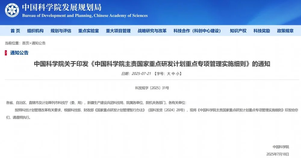 中國科學院正式印發《中國科學院主責國家重點研發計劃重點專項管理實施細則》(以下簡稱《細則》)。