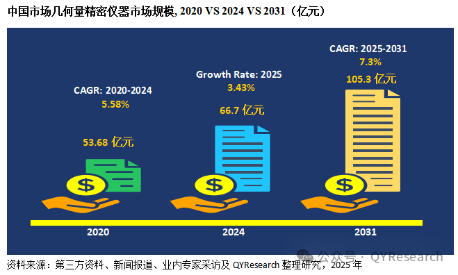 幾何量精密儀器是指用于測量物體長度、角度、形狀、位置、輪廓、形位誤差等幾何參數(shù)的高精度測量設(shè)備,是計量測試領(lǐng)域的基礎(chǔ)儀器之一,在工業(yè)生產(chǎn)、國家計量等領(lǐng)域具有重要作用。根據(jù)研究團(tuán)隊調(diào)研統(tǒng)計,中國市場在過去幾年變化較快,2024年中國幾何量精密儀器市場銷售額達(dá)到了66.7億元,預(yù)計2031年將達(dá)到105.3億元,年復(fù)合增長率(CAGR)為7.3%(2025-2031)。