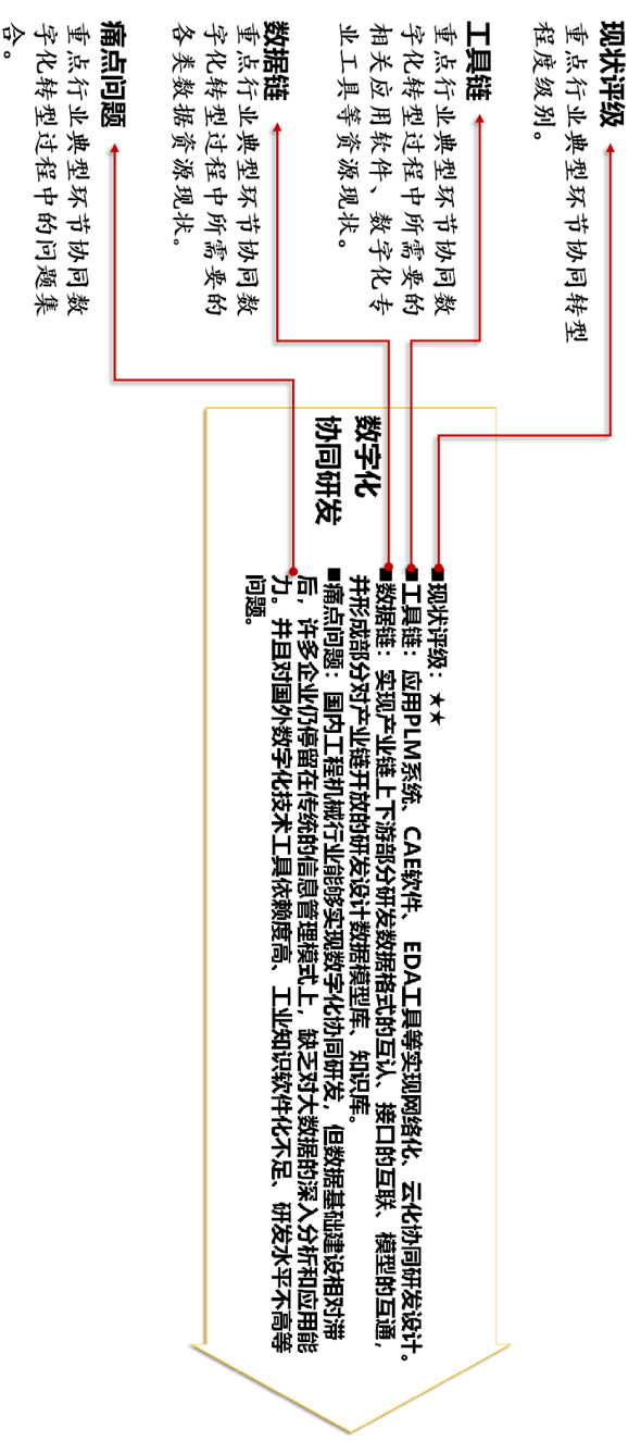 在行業(yè)場(chǎng)景圖譜中,每個(gè)場(chǎng)景由場(chǎng)景編號(hào)、場(chǎng)景名稱、場(chǎng)景現(xiàn)狀評(píng)級(jí)、場(chǎng)景轉(zhuǎn)型價(jià)值標(biāo)簽、各類數(shù)字化要素及場(chǎng)景痛點(diǎn)等內(nèi)容組成,以標(biāo)準(zhǔn)化的方式對(duì)所有場(chǎng)景進(jìn)行描述和表達(dá)。單一場(chǎng)景以工程機(jī)械行業(yè)“產(chǎn)品整體研發(fā)設(shè)計(jì)和仿真測(cè)試”場(chǎng)景為例(如圖2所示),跨業(yè)務(wù)協(xié)同場(chǎng)景以鋼鐵行業(yè)“數(shù)字化協(xié)同管理”場(chǎng)景為例(如圖3所示)。