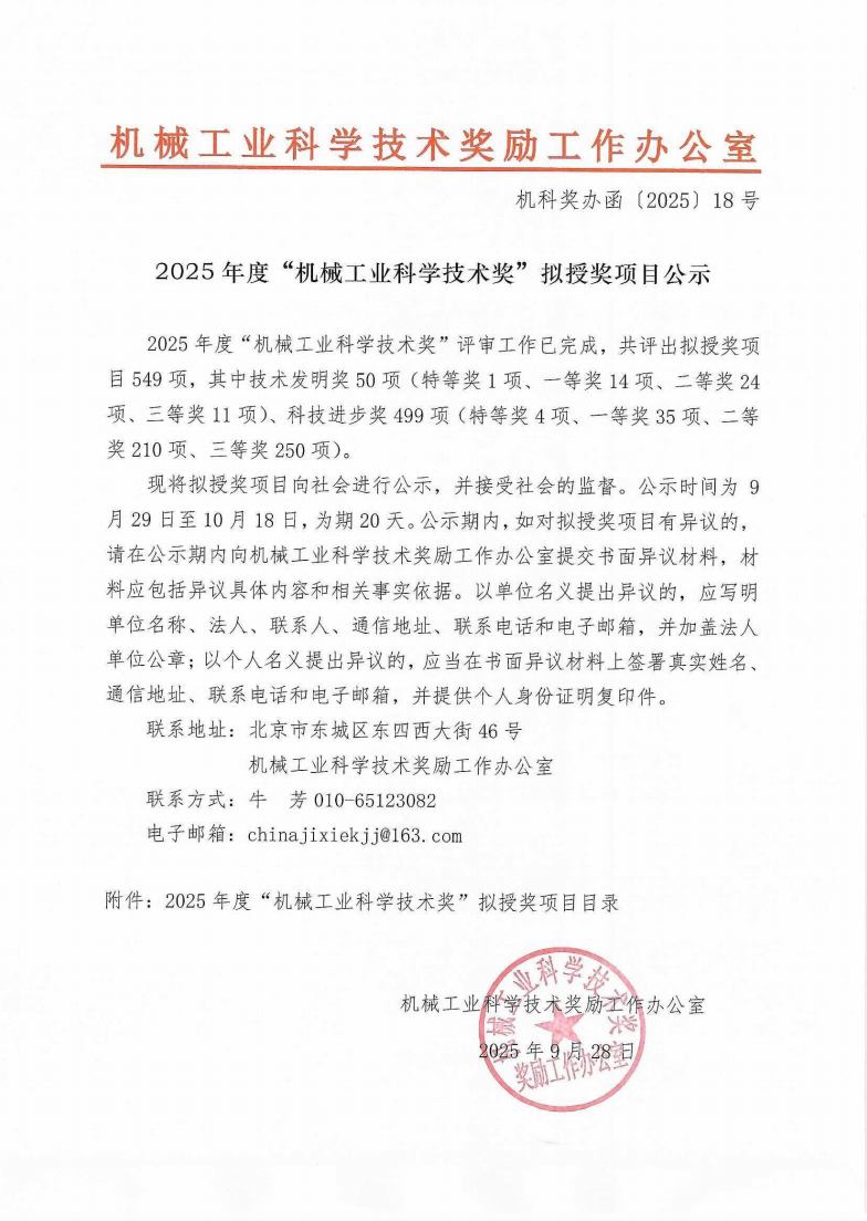 2025年度“機械工業科學技術獎”評審工作已完成,共評出擬授獎項目549項,其中技術發明獎50(特等獎1項、一等獎14項、二等獎24項、三等獎11)、科技進步獎499(特等獎4項、一等獎35項、二等獎210項、三等獎250)