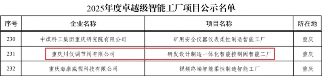 川儀股份所屬重慶川儀調(diào)節(jié)閥有限公司“研發(fā)設(shè)計(jì)制造一體化智能控制閥智能工廠”入選工業(yè)和信息化部“2025年度卓越級(jí)智能工廠”