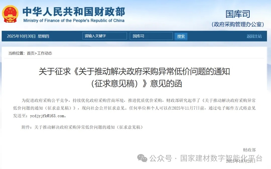 10月28日,財政部發布關于征求《關于推動解決政府采購異常低價問題的通知(征求意見稿)》意見的函。
