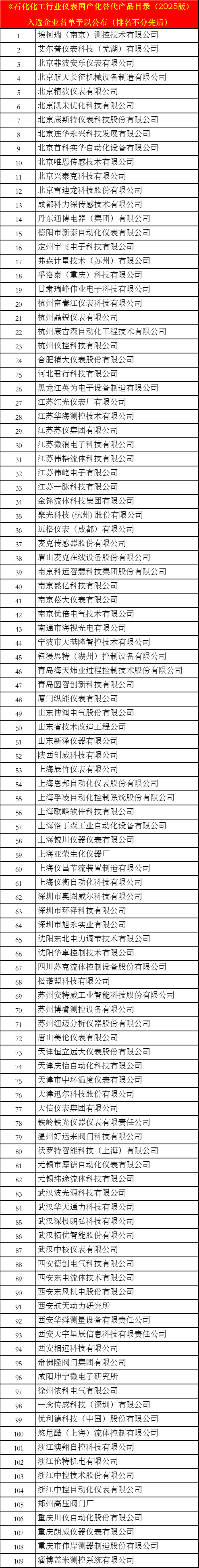 附件:《石化化工行業儀表國產化替代產品目錄(2025版)》入選企業名單