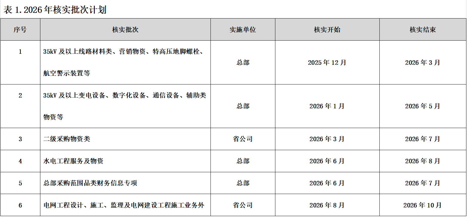 2026年核實工作計劃如表1。根據實際情況,核實時間可能有所調整,各批次具體安排將在國家電網有限公司新一代電子商務平臺(以下簡稱“ECP2.0”)提前發布公告,請以相關公告為準。