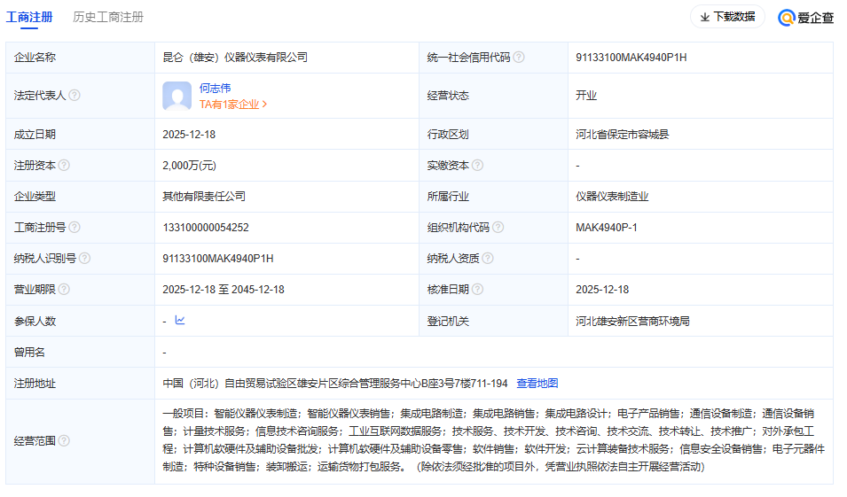 近日,昆侖(雄安)儀器儀表有限公司成立,法定代表人為何志偉,注冊資本2000萬元人民幣,經營范圍涵蓋智能儀器儀表制造與銷售、集成電路設計與制造、通信設備制造、計量技術服務等高新技術領域。