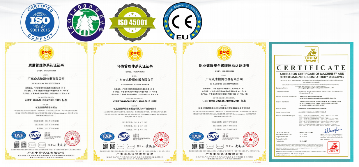 眾志檢測儀器通過了歐盟CE認證、ISO9001:2015質量體系認證、ISO14001:2015環境管理體系認證以及ISO45001:2018職業健康體系認證,確保產品從研發到交付的全流程遵照國際標準。