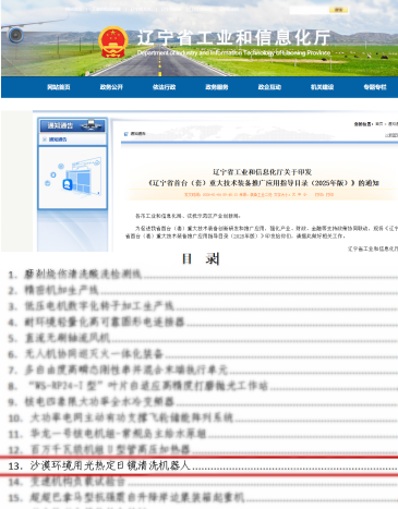 新年伊始,遼寧省工業(yè)和信息化廳正式印發(fā)《遼寧省首臺(套)重大技術裝備推廣應用指導目錄(2025年版)》。我院申報的《沙漠環(huán)境用光熱定日鏡清洗機器人》 項目經(jīng)過嚴格評審,成功獲得“首臺(套)”重大技術裝備認定,并被納入省級推廣應用名錄。這是我院在高端裝備研發(fā)與產(chǎn)業(yè)化應用領域取得的又一重要突破!