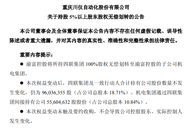 130日,川儀股份(603100)公告,渝富控股將所持四聯集團100%股權無償劃轉至渝富控股的子公司機電集團。本次權益變動后,四聯集團及一致行動人合計持有公司股份數量不發生變化,仍為96,036,355(占公司總股本18.71%)。機電集團通過四聯集團間接持有公司55,604,632 股股份(占公司總股本10.84%)。