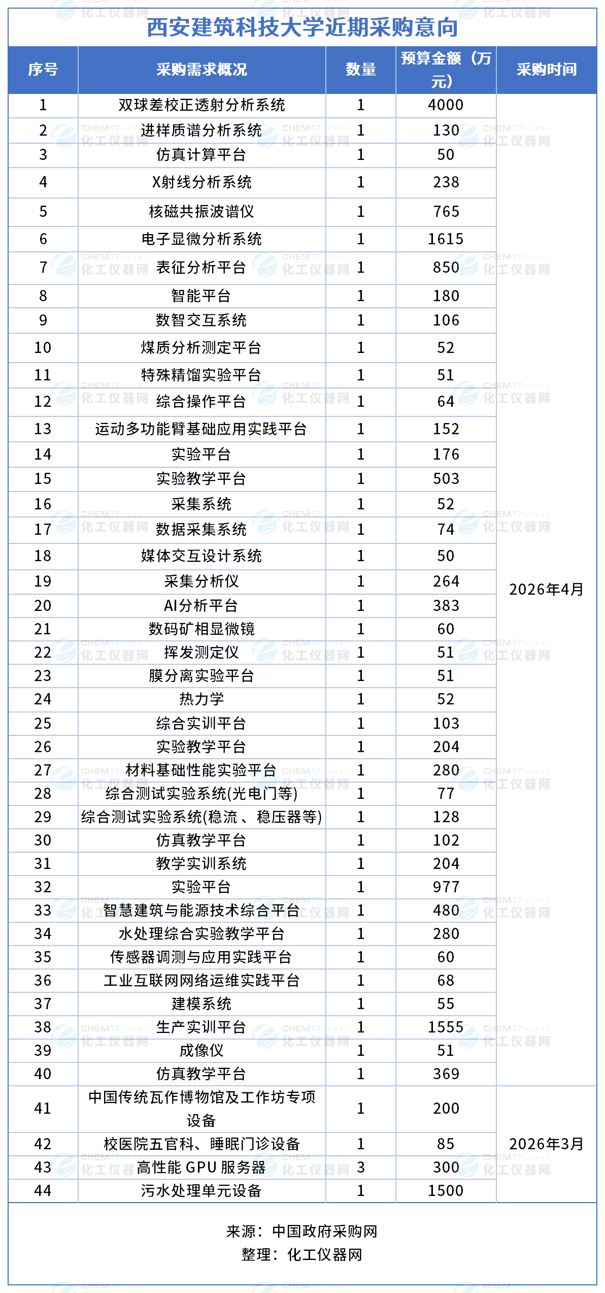 近期,西安建筑科技大學發布多項儀器采購意向,采購預算金額17047萬元,涉及儀器設備包括雙球差校正透射分析系統、進樣質譜分析系統、仿真計算平臺、X射線分析系統、核磁共振波譜儀、電子顯微分析系統等。預計采購時間2026年3月-4月。
