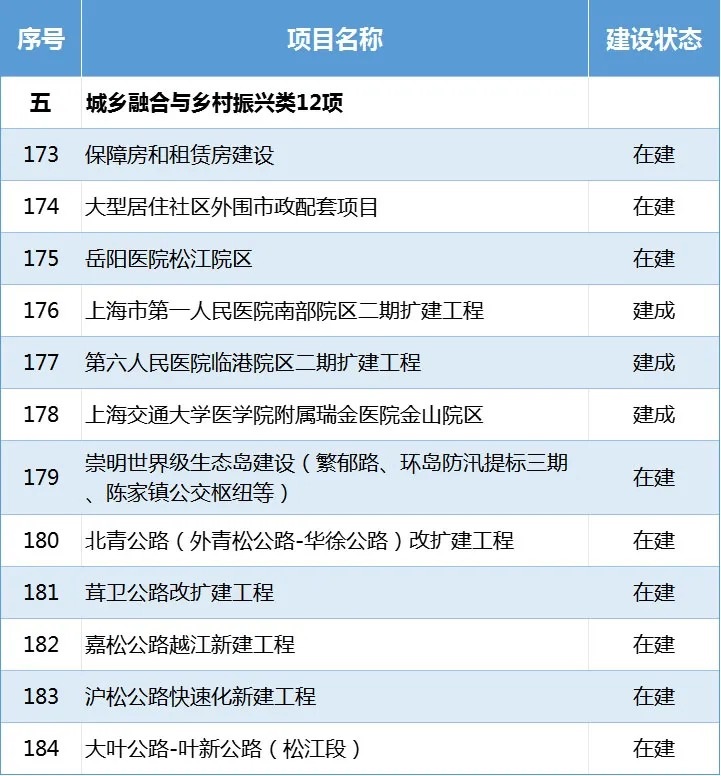在建項目9項:岳陽醫院松江院區、崇明世界級生態島建設、北青公路(外青松公路-華徐公路)改擴建工程等。